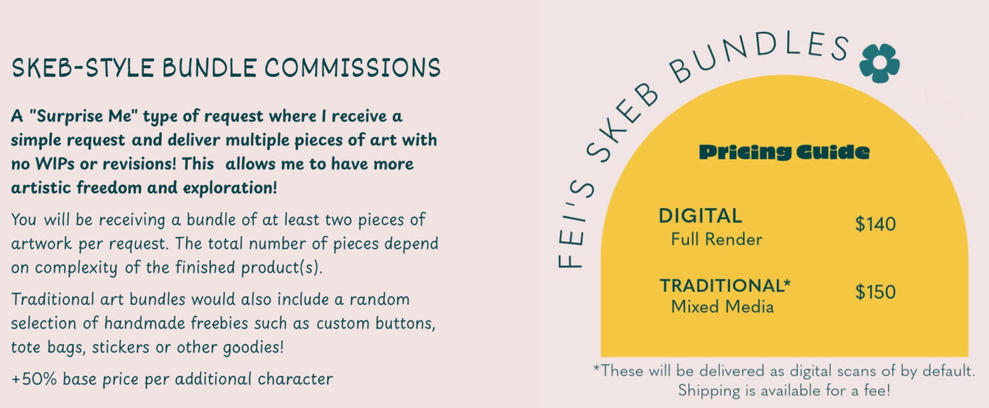 ✿ Commissions may take up to 1 to 9 weeks to produce, and I will do my best to meet this deadline to the best of my ability. Bundles/larger number of commission works may take longer. If any sudden hindrances pop up that may affect my ability to meet the due date, I will let you know. Do tell me if there are specific due dates such as Valentine’s day or birthdays that you would like me to meet.