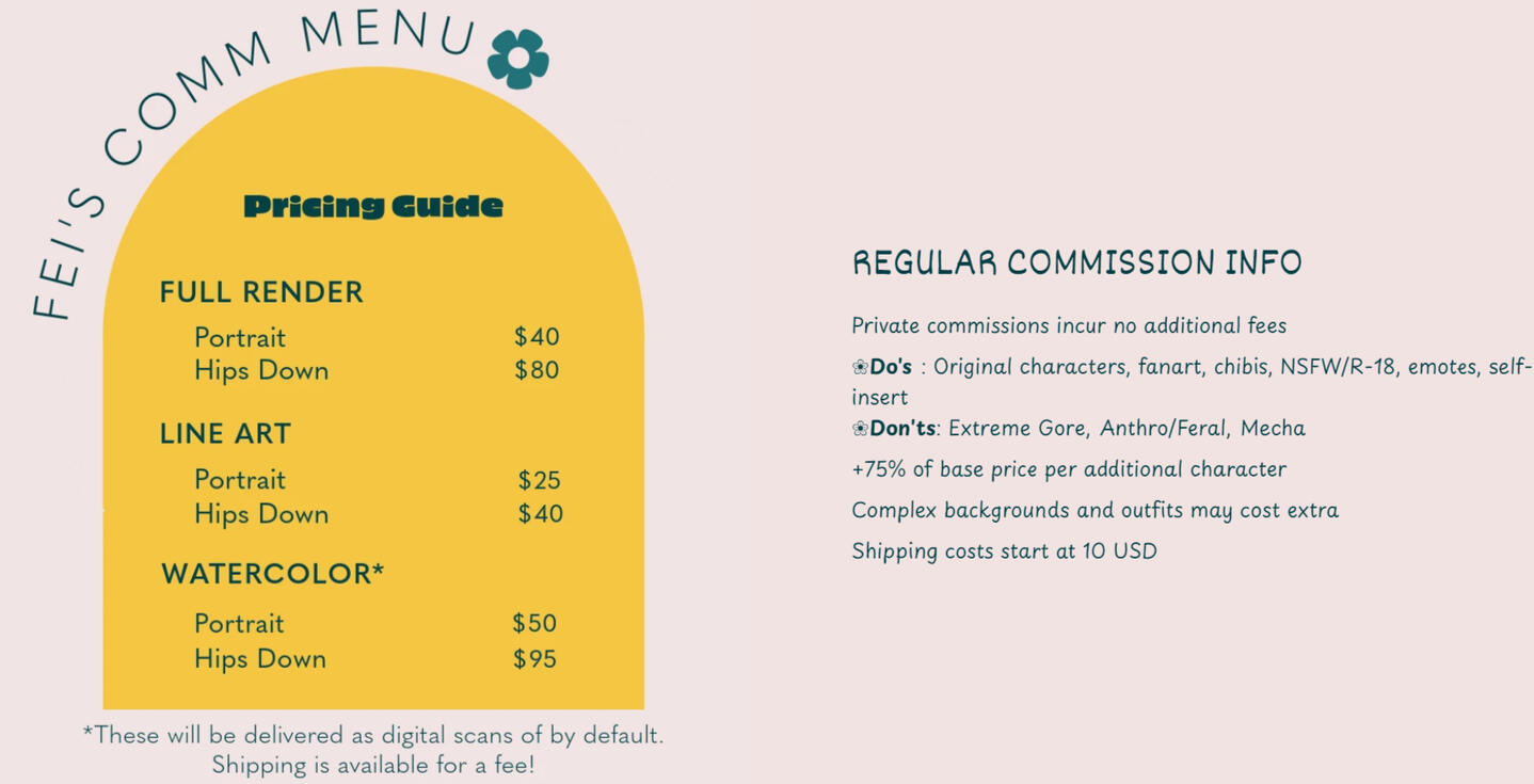 ✿ Clients are more than welcome to share and make minor edits to the commission work. Please provide credit when posting on social media.